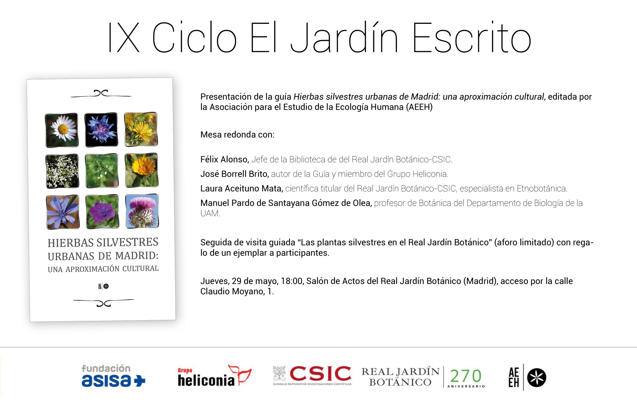 El jueves, 29 de mayo de 2025 se presentó en el Real Jardín Botánico, en Madrid, la guía y el cartel Hierbas silvestres urbanas de Madrid: una aproximación cultural, materiales editados por la Asociación para el Estudio de la Ecología Humana en colaboración con la cooperativa Grupo Heliconia y gracias al patrocinio de la Fundación Asisa. Los textos y las fotografías han sido realizados por José Borrell Brito, licenciado en Biología por la Universidad Autónoma de Madrid y cofundador de la cooperativa Grupo Heliconia, entidad en la que desarrolla su actividad profesional, coordinando sus actividades educativas.